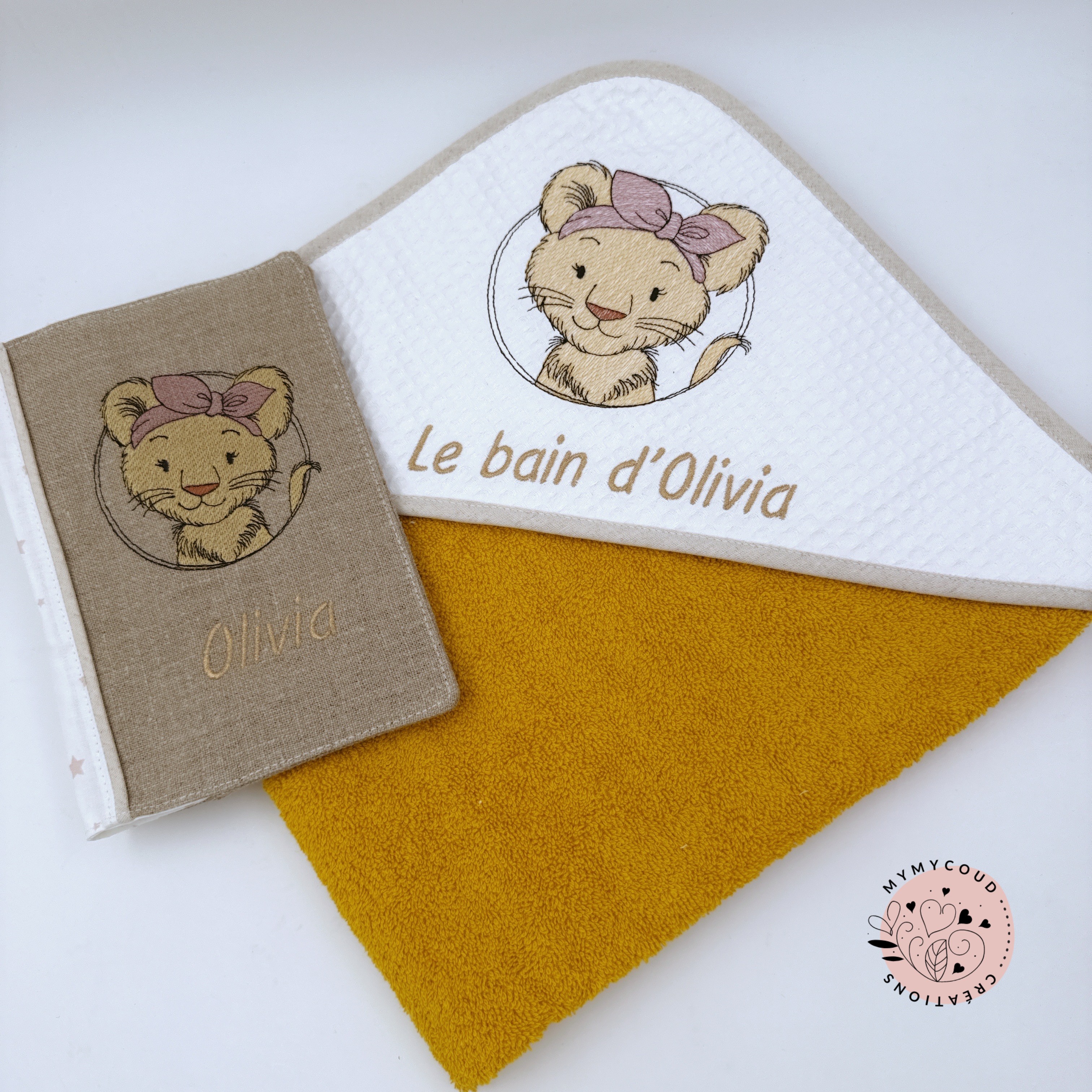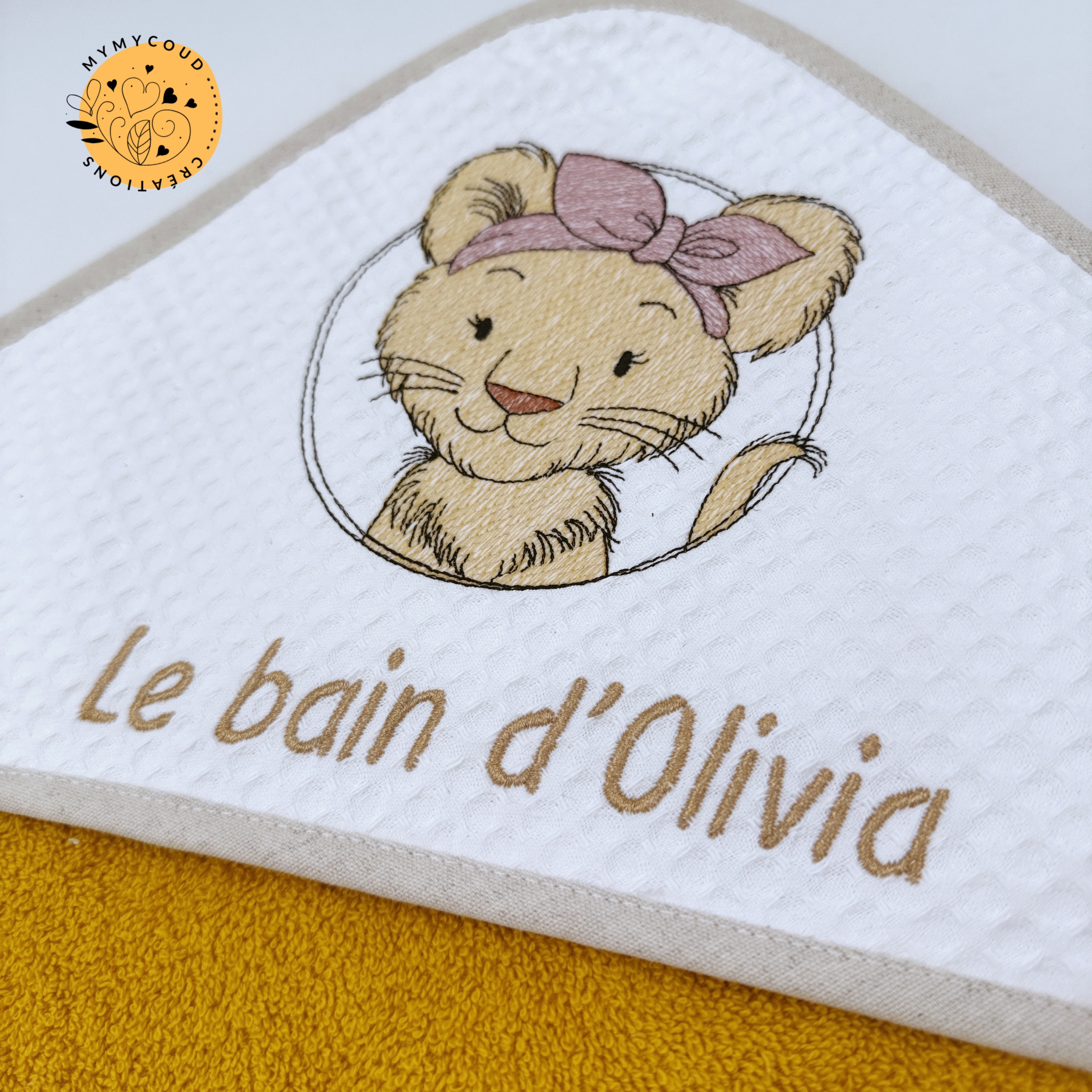 Sortie de bain ou cape de bain bébé brodée lionne et personnalisée