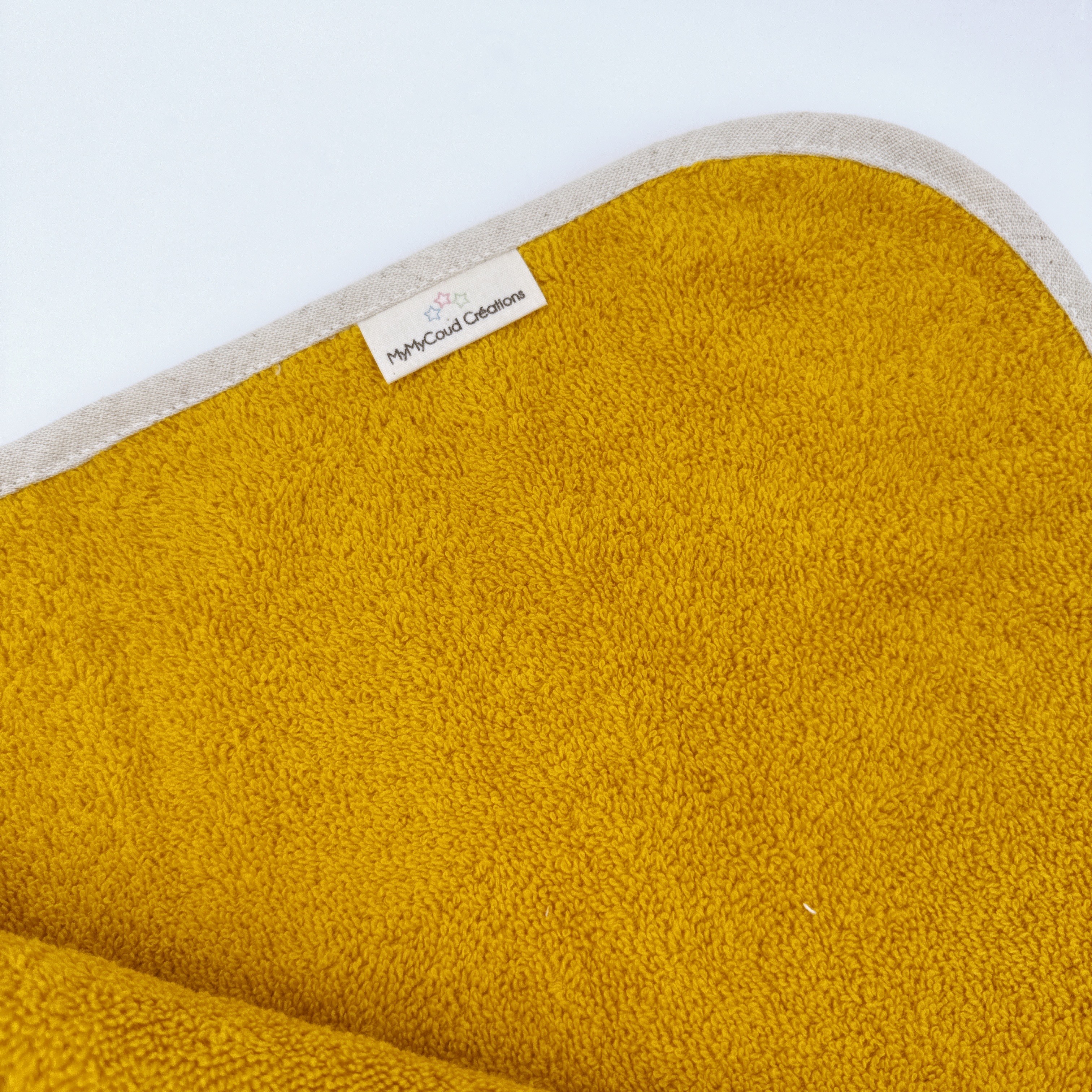 Elle est confectionnée en éponge 100% coton de couleur jaune moutarde mais pourra se faire dans pleins d'autres couleurs !